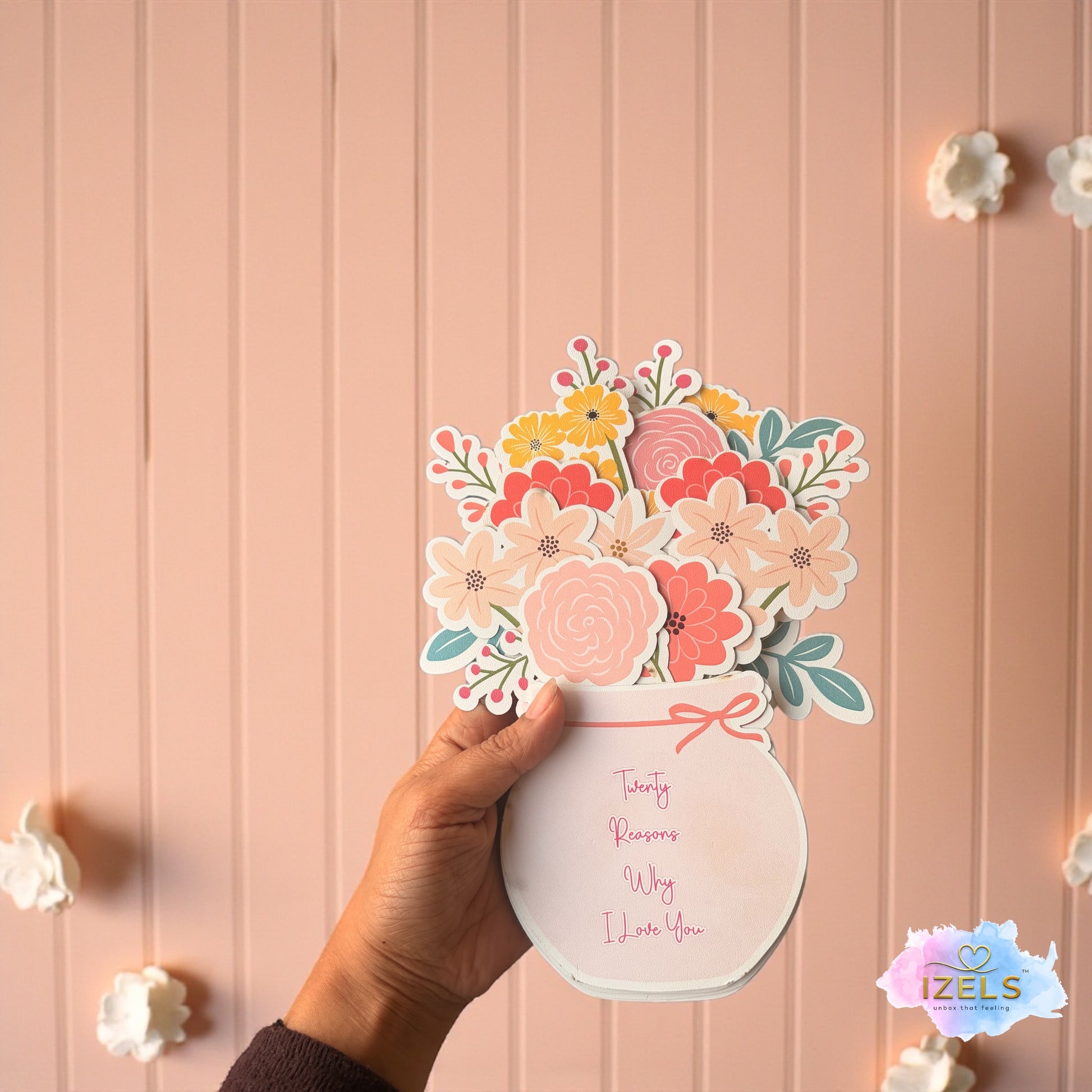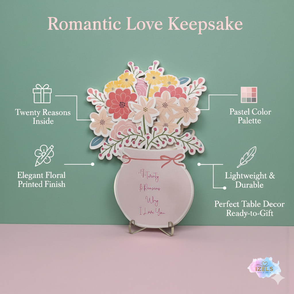 A charming floral jar table décor featuring “Twenty Reasons Why I Love You,” thoughtfully designed to express heartfelt emotions through beautiful illustrations and meaningful words. This elegant keepsake is perfect for celebrating love and makes a thoughtful gift for anniversaries, Valentine’s Day, birthdays, or special moments. Adding warmth and romance to any space, it serves as a timeless reminder of love and appreciation.