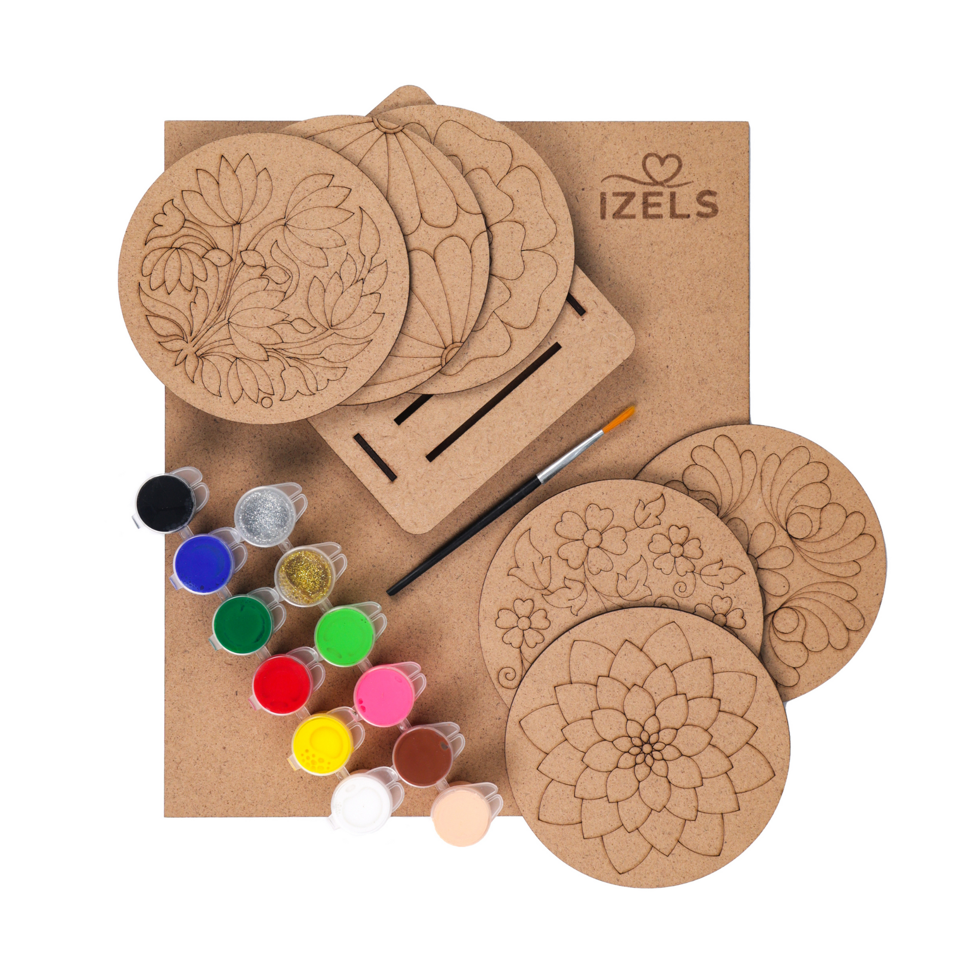 COMPLETE DIY COASTER PAINTING SET: Includes 6 pre-marked wooden coasters (4×4 inches, 3 mm thick MDF), 1 wooden stand, 12 non-toxic acrylic colours, and 1 paint brush – a complete paint-your-own coaster kit.