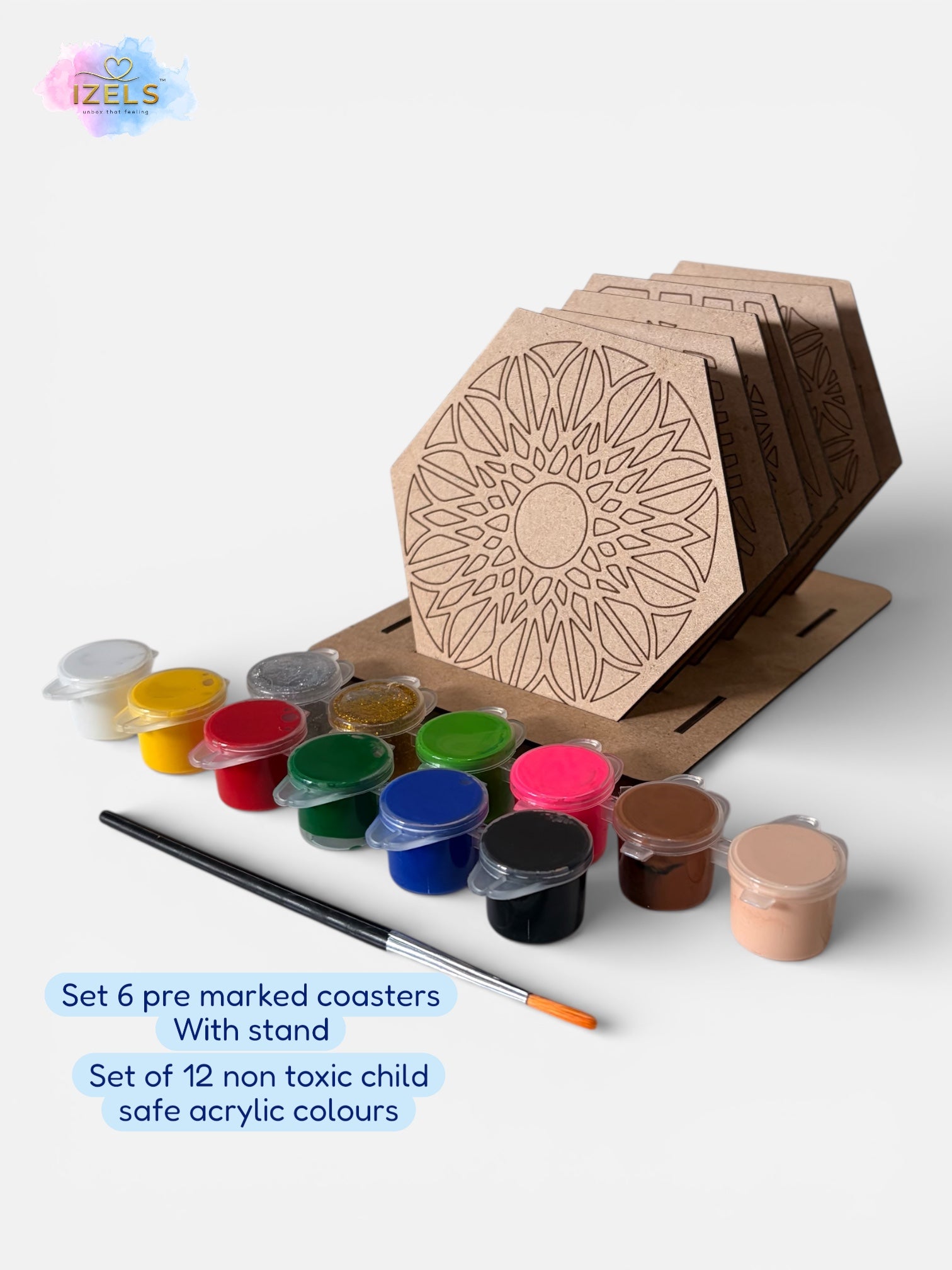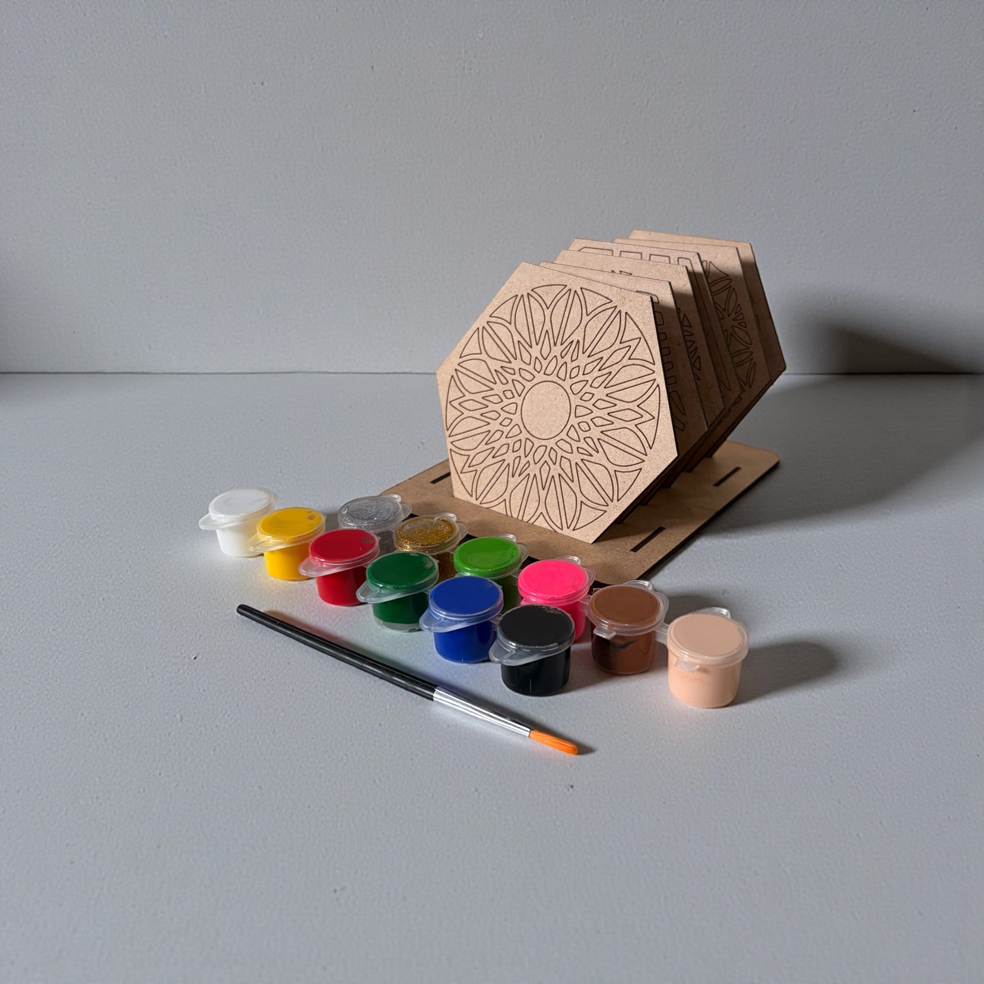 COMPLETE DIY COASTER PAINTING SET: Includes 6 pre-marked wooden coasters (4×4 inches, 3 mm thick MDF), 1 wooden stand, 12 non-toxic acrylic colours, and 1 paint brush – a complete paint-your-own coaster kit.