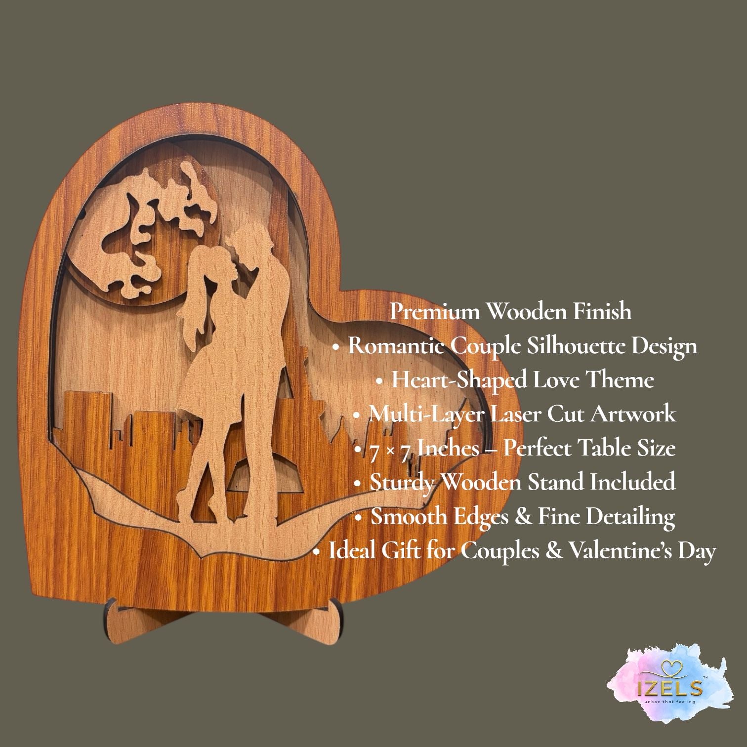 This beautifully crafted heart-shaped wooden décor is precision laser-cut from premium natural wood, showcasing an intricate layered silhouette of a couple set against a charming cityscape. Designed as a free-standing tabletop piece with a sturdy base, it adds warmth, romance, and artistic elegance to any space. Measuring 7 × 7 inches, this timeless showpiece is perfect for decorating shelves, side tables, or desks. Ideal for anniversaries, weddings, housewarmings, or heartfelt gifting, it beautifully symbolizes love, togetherness, and shared dreams.